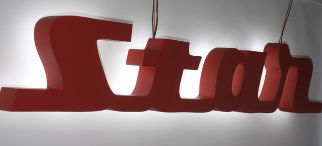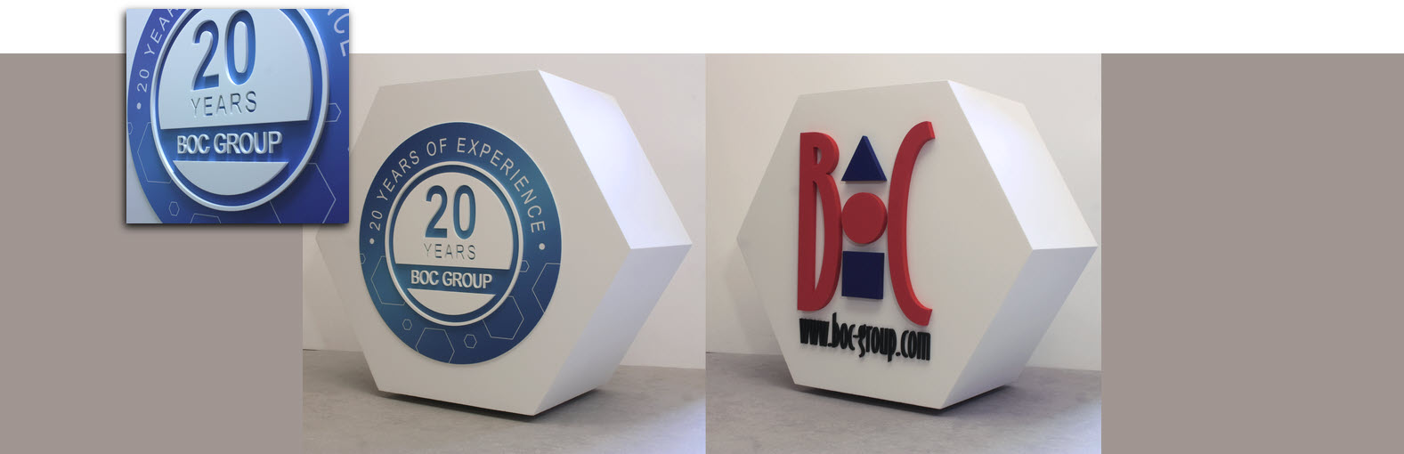 3D Logo Objekt, aus EPS (Styropor) mit Deckschichten aus PVCEPS / Styropor Hartschaumkern in Modellbauqualität, abgedeckt mit 3 mm PVC-HS Platten, Kanten den Sockels PU-Harz beschichtet und alles in CI Farben lackiert. Der kleine Schriftzug am Sockel ist aus 8 mm weißem Acrylglas per Laser geschnitten. Das Oberteil wird einfach in den Sockel gesteckt.